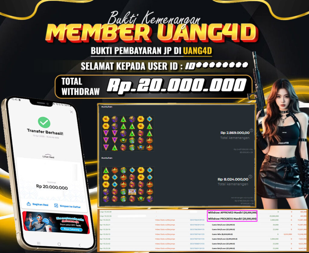Jangan lewatkan kesempatan untuk meraih kemenangan besar. Daftar sekarang di UANG4D dan rasakan pengalaman bermain slot terbaik yang pernah ada! Putar gulungan, menangkan jackpot, dan jadilah bagian dari komunitas pemain sukses kami!