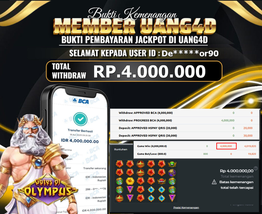 UANG4D JACKPOT SLOT GATES OLYMPUS 18 APRIL 2025, Kemenangan Slot, Bukti Kemenangan Slot, Kemenangan Slot Pragmatic Play, Menang Slot online, Slot Gacor, Situs Aman Terpercaya, Withdraw Berapapun Pasti DI Bayar Tuntas, Maxwin Slot Online.